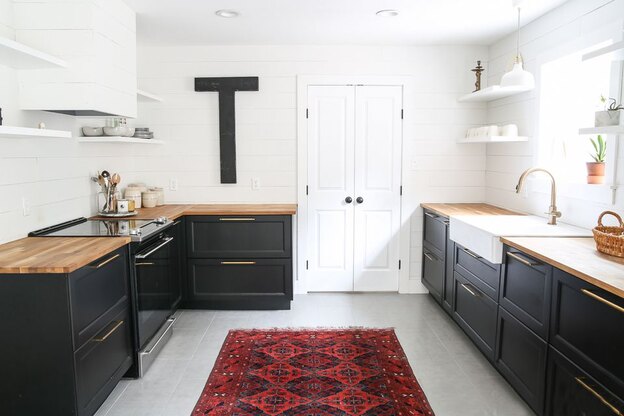 کمی تفاوت در جزیره آشپزخانه و کابینت ها می تواند به فضا بعد جدیدی ببخشد. در این آشپزخانه جزیره چوبی با کابینت های چوبی، پیشخوان مشکی و کابینت مشکی در بالا، هماهنگ شده اند. در کنار کابینت ها، قالیچه نیز جلوه زیبایی دارد.