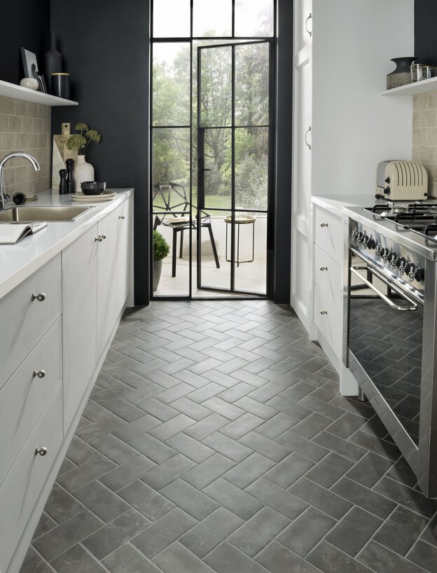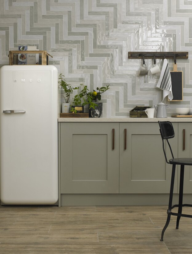 طرح تیغ ماهی همانطور که بای دیوارها خاصیت وسیع کنندگی دارد، اگر روی کف هم باشد کاری می کند که چشم خطوط را به سمت بیرون دنبال کند و در نتیجه کف آشپزخانه عریض ر و طولانی تر به نظر می رسد. اگر همزمان از مزایای یک کاشی با روکش براق هم بهره مند شویم چطور؟ نور بازتاب یافته کاری می کند اتاق بزرگتر و روشن تر شود.