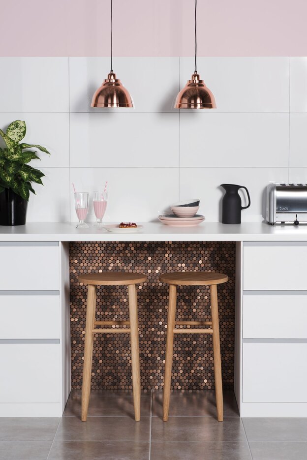 یک کلک دیگر که با رنگ باشد هم بگوییم؟ استفاده از رنگ ها تیره در ارتفاع پایین تر از کمر / کابینت/ اوپن و قرار دادن رنگ های روشن در قسمت های بالایی می تواند کاری کند که یک فضا کوچکتر به نظر بزرگتر بیاید. این کاشی های تیره در محل بی نقصی نصب شده اند، همچنین روکش براقشان نور را منعکس می کند، و عمق بیشتری به فضا داده و خیلی هیجان انگیز است. یک معامله دو سر برد.