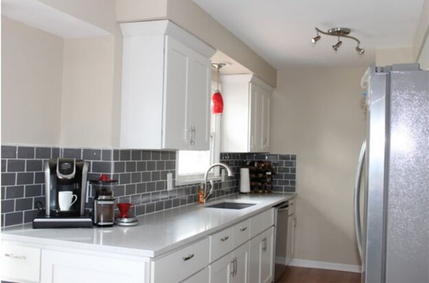 - این کاشی سرامیکی همه جای دیوار پشت سینک و کابینت های آشپزخانه را پوشانده است.