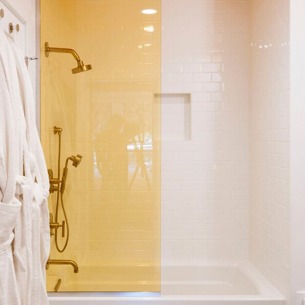 سقف زرد روشن و صفحه ی دوش این حمام کوچک را به یک کانون گرم واقعی تبدیل می کند، در حالی که نور گیرها و کاشی های سفید فضا را روشن و بزرگ نگه داشته اند.