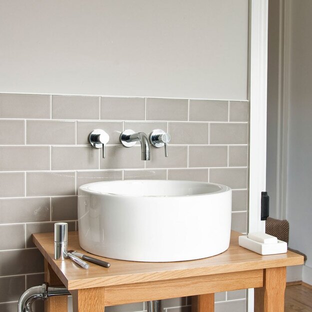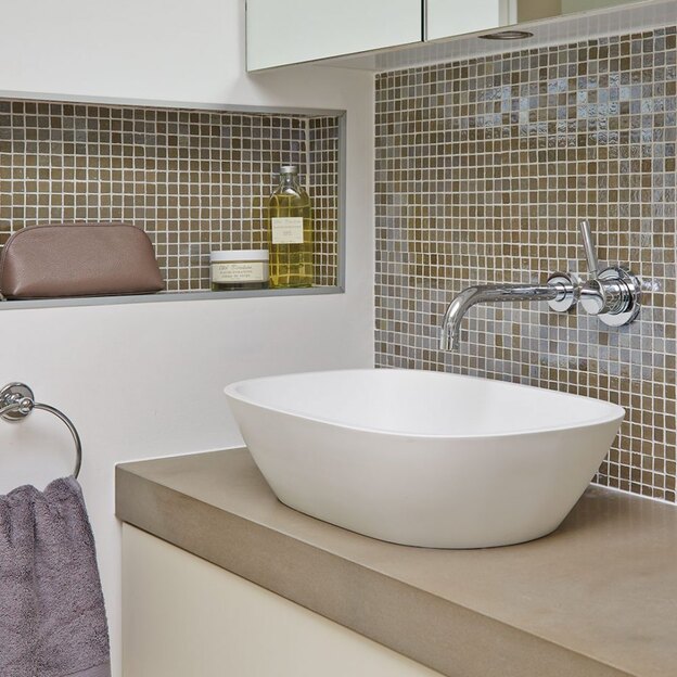 پنل های باریک و شیاردار از لحاظ بصری به حمام شکل میدهد و یک قفسه ی کاربردی در بالای آنها می تواند پذیرای لوازم کوچک، لوازم آرایشی و دکوری ها باشد. رنگ سدری یک انتخاب آرامش بخش برای حمام است، و به فضای کوچک و جمع و جور جذابیت القا میکند.