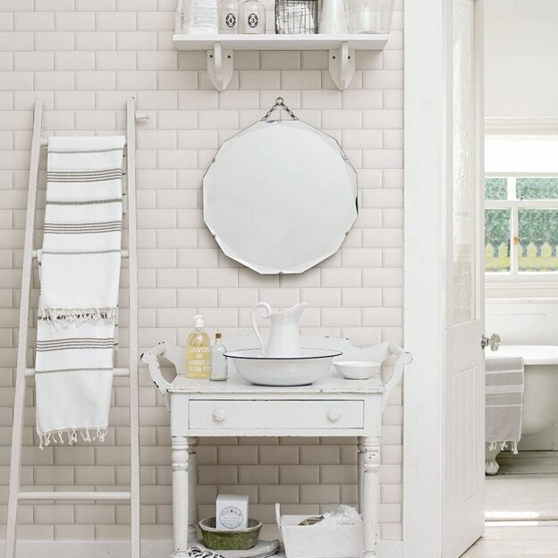 با چسبیدن به یک طرح کلا سفید ساده یک حمام جمع و جور را بزرگت نشان دهید. یک مجموعه ی سفید با کاشی های دیواری صیقلی و تعدادی حوله با بافت مخمل فضا را خوشایند می سازد.