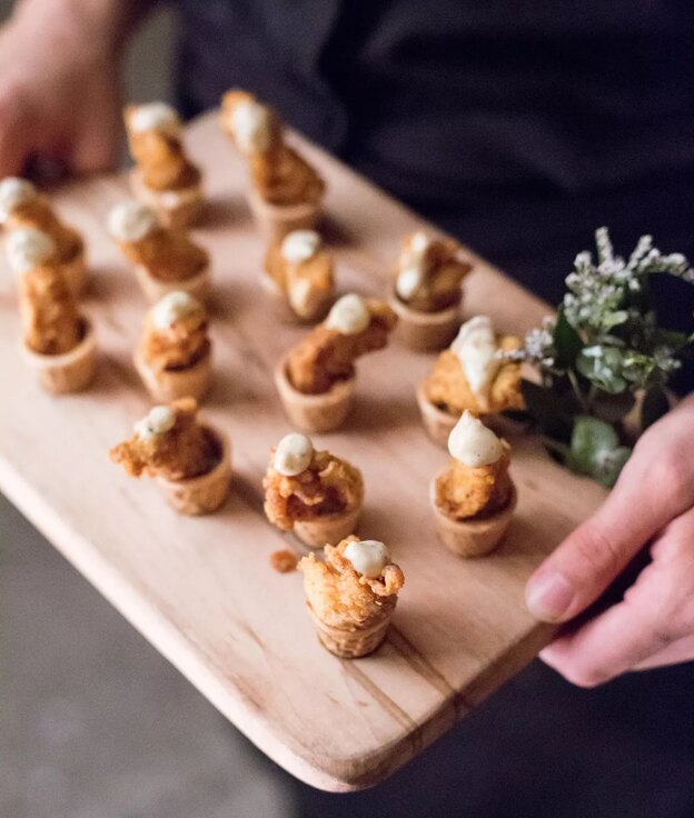 اگر می خواهید مرغ سرخ شده  یک قدم جلوتر از حد خورد برود، این غذای کلاسیک را در مخروط های وافل زیبا و به اندازه ی یک لقمه قرار دهید.