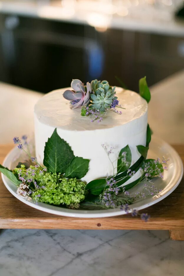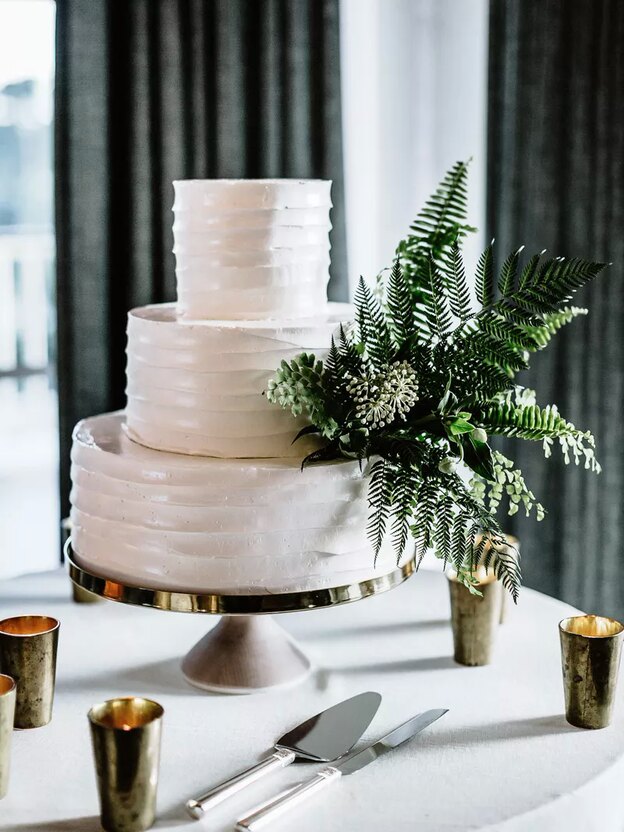 استفاده از گیاهان در کیک، کار جدیدی نیست اما ما بجای استفاده از اکالیپتوس و دیگر گیاهان معروف عروسی از سرخس استفاده کردیم. این کیک با خامه سفید به طور ظریف روکش شده، و شبیه به جفتی ظریف تر از کیک "روستایی" شده است.