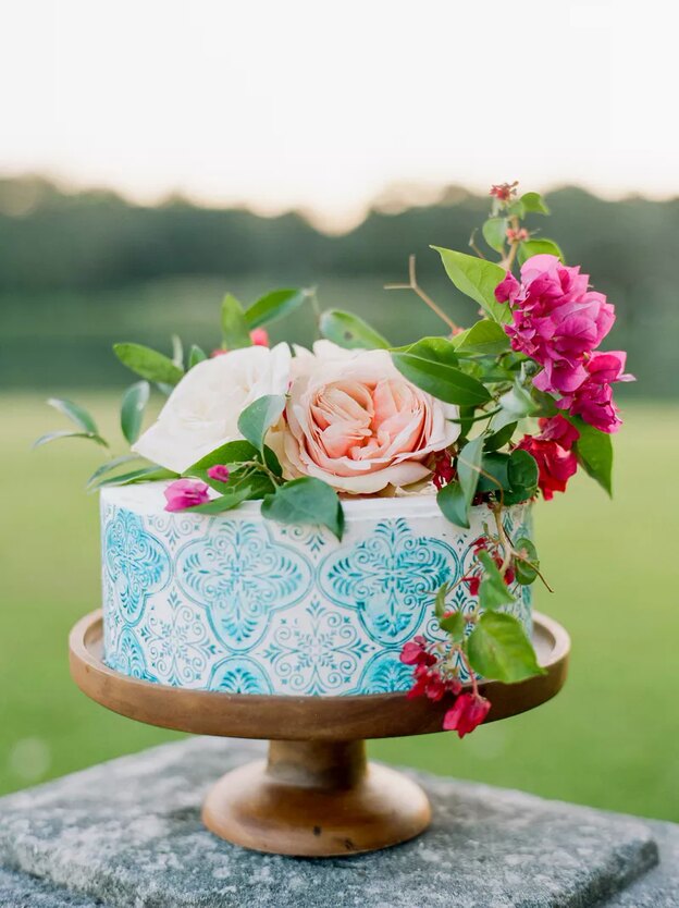 ایده خوبی برای کیک چند ردیفی است، مگر نه؟ آیا طراح کیک شما فوندانت را رنگ (یا روی آن چیزی چاپ)می کند؟ آن هم با الگوهای پیچیده الهام گرفته شده از کاشی در رنگ های آبی، سفید و زرد.