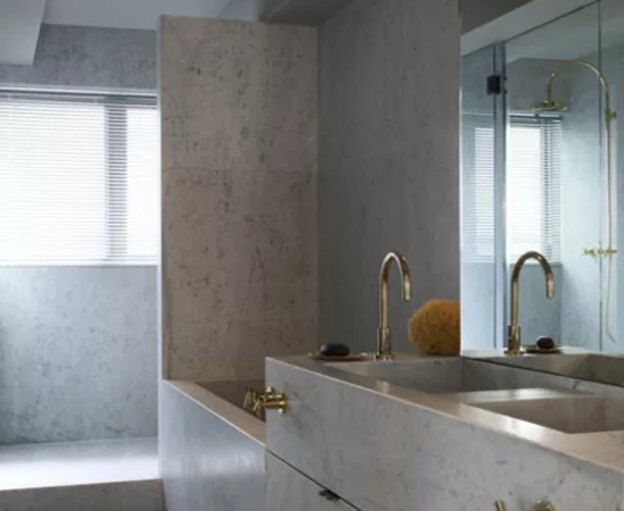 اگر واقعا مرمر را دوست دارید این حمام برای شما مناسب است. در این طراحی برای سینک و وان از سنگ های بزرگ مرمر و برای کف و دیوار از کاشی های بزرگ آن استفاده شده است. شیرآلات برنجی تنها رنگ آمیزی این فضا محسوب می شوند. بنابراین یک فضای مینیمال و خلوت و در عین حال مدرن پدید می آید.
