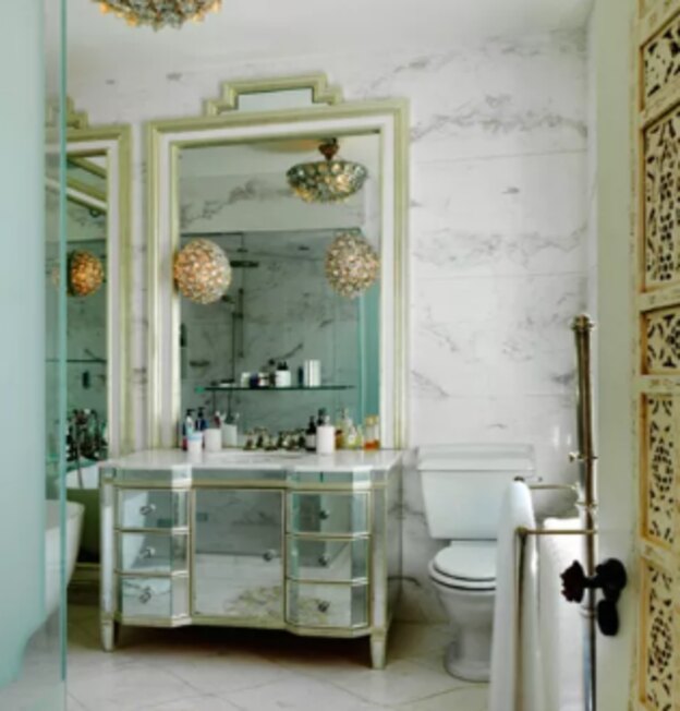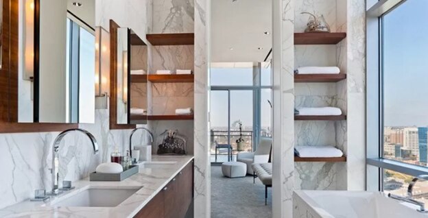 این حمام نماد استفاده از تم سنگ مرمر است. طراحان برای دیوار و کف از مرمر و برای پیشخوان از شیشه استفاده کرده تا زیبایی سنگ مرمر بیشتر به چشم بیاید. فضای کلی مرمر فضا را لوکس و دیدنی نشان می دهد که البته لوستر این زیبایی را دوچندان می کند.