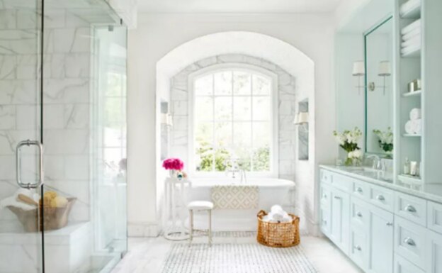 در یک حمام بزرگ ممکن است از مرمر بیش از حد استفاده شده و به هدر برود، اما می بینید که در اینجا به اندازه کافی استفاده شده است. قسمت طاقی شکل مرمر فضا را بزرگ تر نشان می دهد. کاشی های موزاییک دیواری در کنار کفپوش بزرگ مرمر برای کف استفاده شده است.