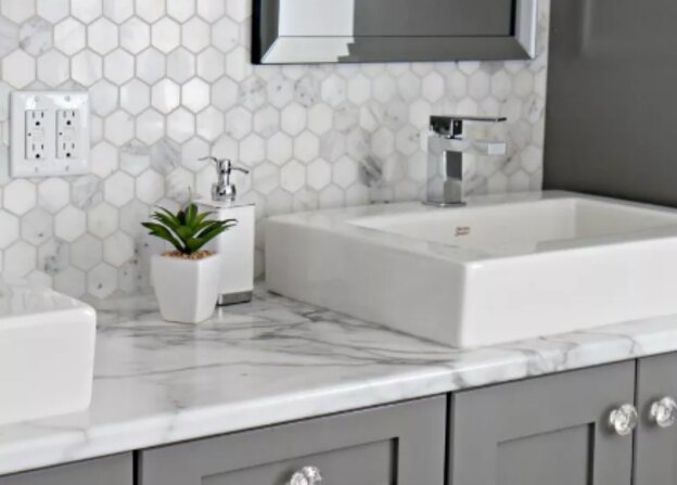 آیا دوست دارید از مرمر استفاده کنید اما بودجه تان اندک است؟ در این حمام متوجه می شوید که می توانید با بودجه کم از آن استفاده کنید. پیشخوان لمینت و کاشی دیواری مرمر واقعی است. کاشی شش ضلعی جذاب و متفاوت است و هزینه ها نیز کاهش می یابد.