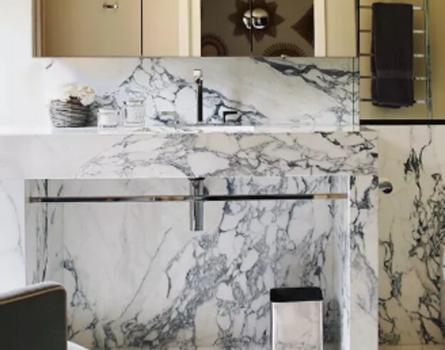این حمام زیبا از اشکال مختلف استفاده می کند. دو کابینت مشکی در طرفین یک وان قرار گرفته اند و کفپوش نیز از کاشی های بزرگ مرمر ساخته شده است. پیشخوان از سنگ مرمر با رگه های بزرگ تشکیل شده است. موزاییک های شیشه ای روی دیوار هم یادآور مرمر است.