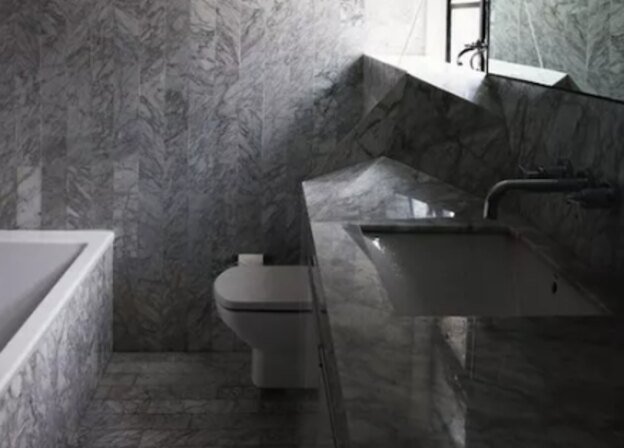 آیا دوست دارید یک فضای تیره تر داشته باشید. این مرمر تیره بسیار جذاب است. در این تصویر یک طراحی معاصر و مینیمال را می بینید که با کمک مرمر تیره تر خلق شده است. ببینید کاشی های روی دیوار چه کانتراست زیبایی را خلق کرده اند. شیرآلات دیواری فضا را زیباتر و تمیزتر نشان می دهند.