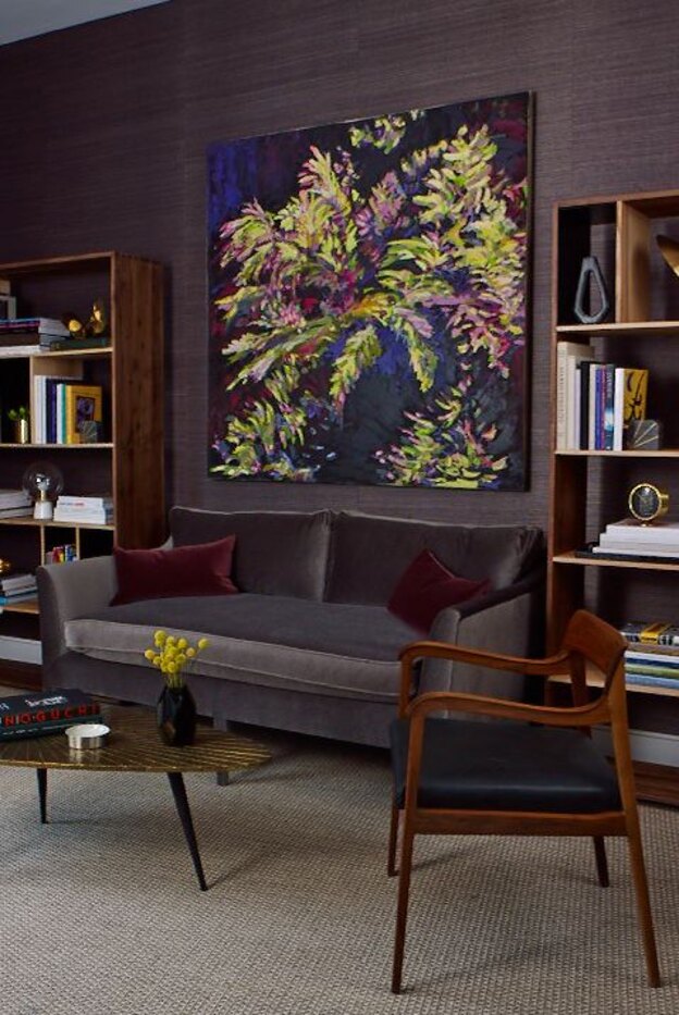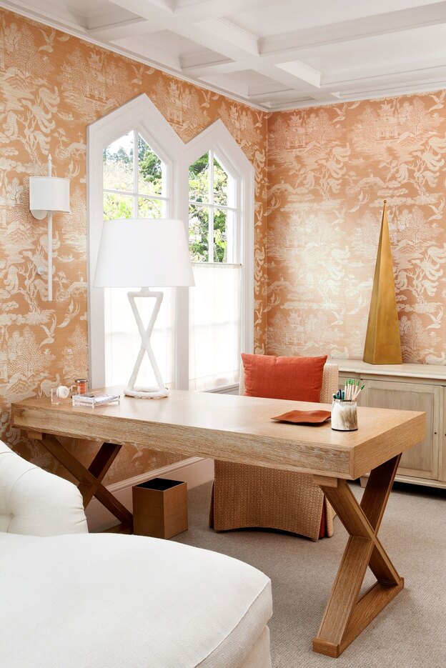 این اتاق آفتاب گیر کالیفرنیایی با طراحی هدر هیلیارد، شبیه یک نشیمن و یک اتاق کار خانگی است. به گفته هیلیارد زن پشت میز کار کرده، و همسرش هم روی کاناپه چرب می زند. طرح های چاپی روی دیوار از لی جوفا فضا دلپذیری ایجاد می کند که بازدهی را افزایش داده، و در مقابل نور خورشید می درخشد. این طرح های چاپی بافت زیرین را دیدنی و عمیق نشان می دهند.