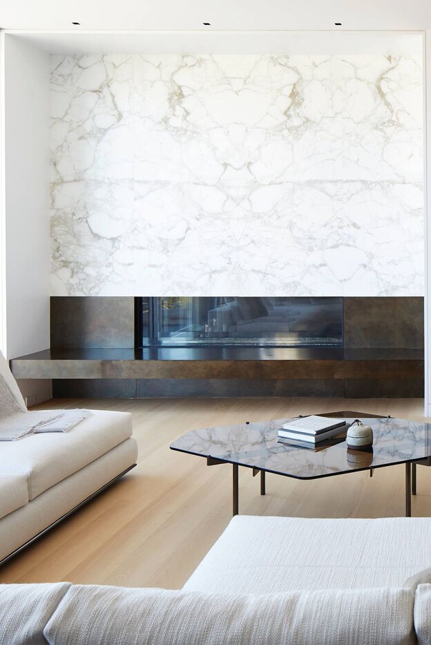 یک صفحه بزرگ مرمر روی دیوار خیره کننده است. در این صورت طرحی شیک و زیبا و در عین حال بافت دار ایجاد می شود.