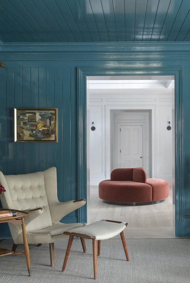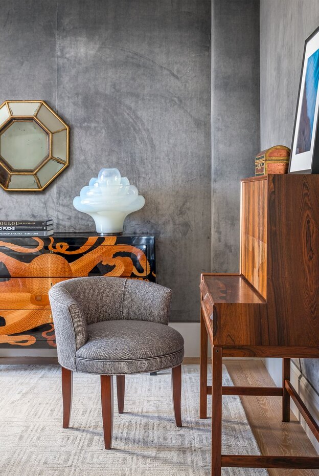 تام استرینگر طراح با استفاده از کاغذ دیواری پوست مصنوعی کروکودیل از رالف لورن این محیط را تمیز و کلاسیک کرده است. او می گوید رنگ های تیره در صورت براق بودن پرطنین هستند.