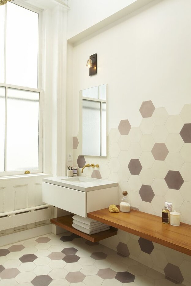 اگر نمی خواهید کل دیوار را با سرامیک بپوشانید، می توانید بخشی از دیوار را با سرامیک پنج ضلعی کف بپوشانید تا چنین حالتی ایجاد شود.
