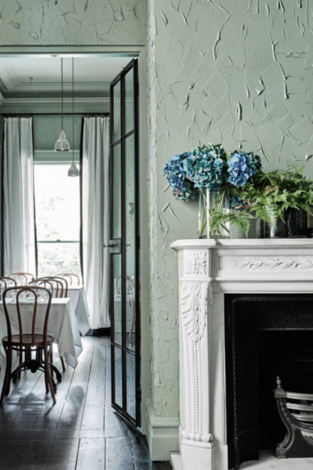 در صورتی که رنگ را به جای شت و رولر با بیلچه تخت گچ کاری روی سطح بمالید به آن عمق می بخشد. این دیوار سبز روشن شبیه یک اثر هنری است که گویی طرحی از دیوار محسوب می شود نه فقط رنگ.