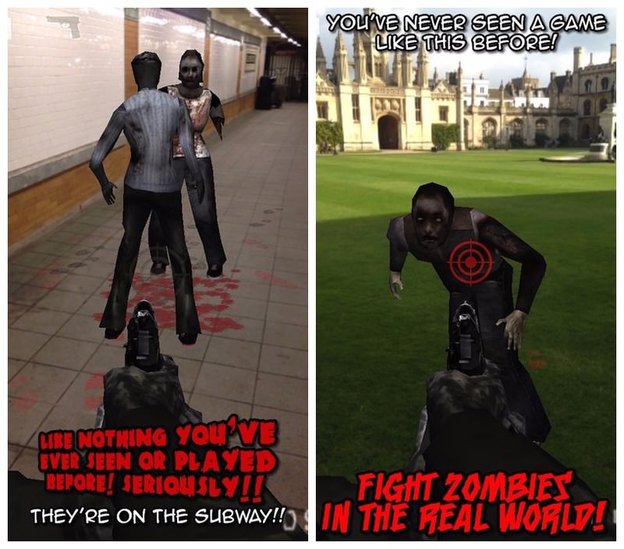 شلیک کردن به صورت زامبیها کار جالبی می تواند باشد اما جالب تر می شود وقتی که زامبی ها در دنیای واقعی به شما حمله می کنند. در این بازی شما مورد حمله زامبی ها قرار می گیرید و از طریق دوربین میتوانید بررسی کنید و با اسلحه های فوق العاده به هم شلیک کنید. با توجه به حرکت و نوع چرخش دوربین حرکت میکنید و هدف را در نظر میگیرد. اسلهه های آرسنالتان نیز بسیار جالب اند. شامل یک شعله پرتاب کن ، شات گان ، مگنوم ، ای کی 47 ، و بسیاری دیگر. اما بازی 0.99 دلار هزینه به اضافه ی 0.99 برای باز کردن قفل ها از شما دریافت می کند.