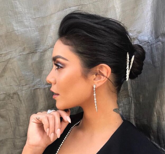 - ونسا هاجنز خوب می داند چطور مدل ابتدایی و ساده ای با یک گوجه در بالا سر درست کرده و در عین حال کاری کند که راحت و با شکوه به نظر برسد. چگونه؟ با جلو ریختن دو دسته از چتری هایش مثل یک آرایشگر حرفه ای. اینگونه.
