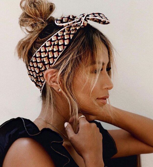 - رزی هانتینگتن وایتلی یکی از باحال ترین روش های دستمال سر بستن را در این پست اینستاگرامی اش نشان داده است. خیلی هم ساده است. موهایتان را بالای سر گوجه ای جمع کنید و دو شاخه از چتری ها را روی صورتتان در دو طرف بریزید (اگر هم موهای طبیعی تان موج دار است که چه بهتر). سپس یک دستمال سر یا هد بند را وسط سرتان ببندید. او در این عکس "توربند"ی که خودش با همکاری کولت گایا تولید کرده است (60 دلار) را به سر دارد. این مدل در حال حاضر در وبسایت این برند تمام شده است بنابراین باید تا دوباره شارژ شود صبر کنید تا دستتان بهش برسد. اگر نه، می توانید یک طرح دیگر از این برند را بخرید.