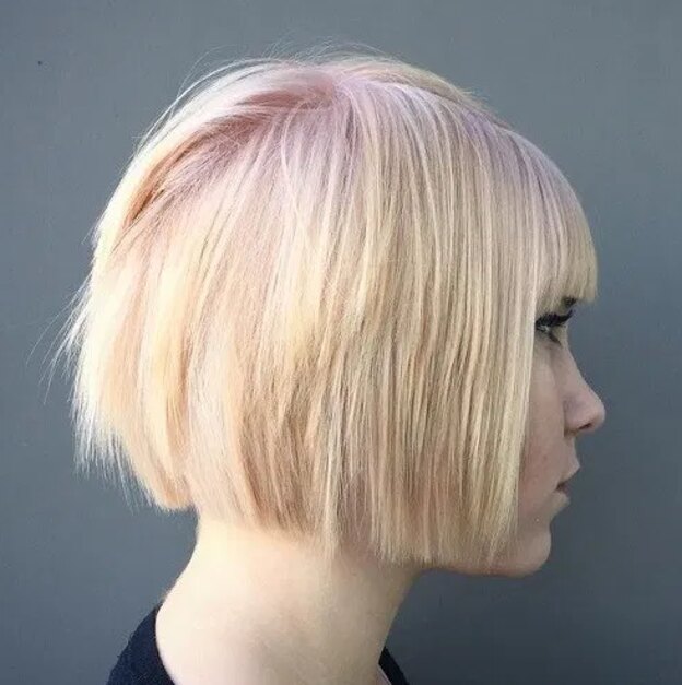 این مدل که یادآور عروسک های چینی است، مناسب افرادی است که موی کم پشتی دارند. در این مدل شاهد چتری های نوک تیز، کوتاهی تا خط چانه، موی بلوند و سایه های صورتی در سراسر مو هستید.