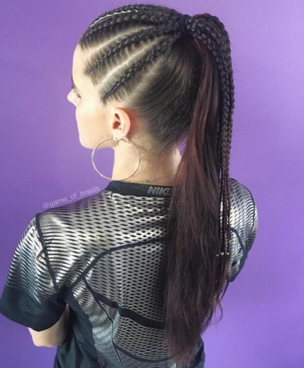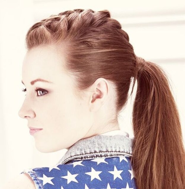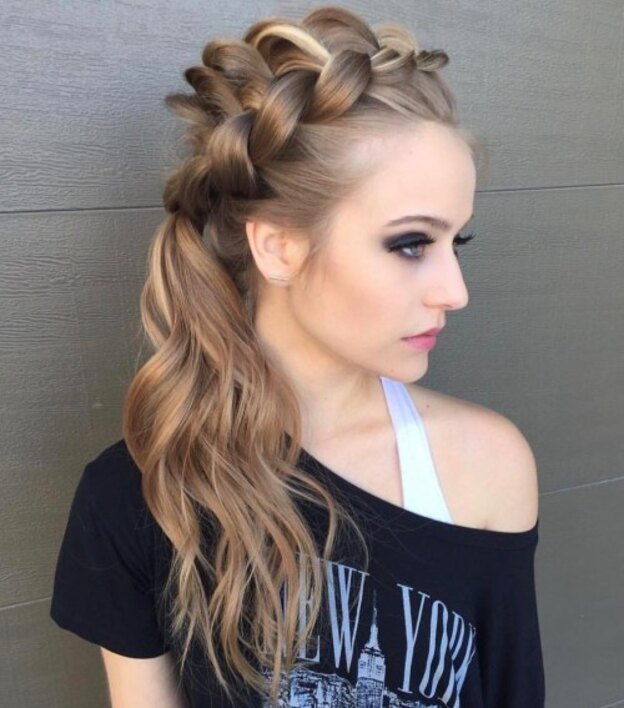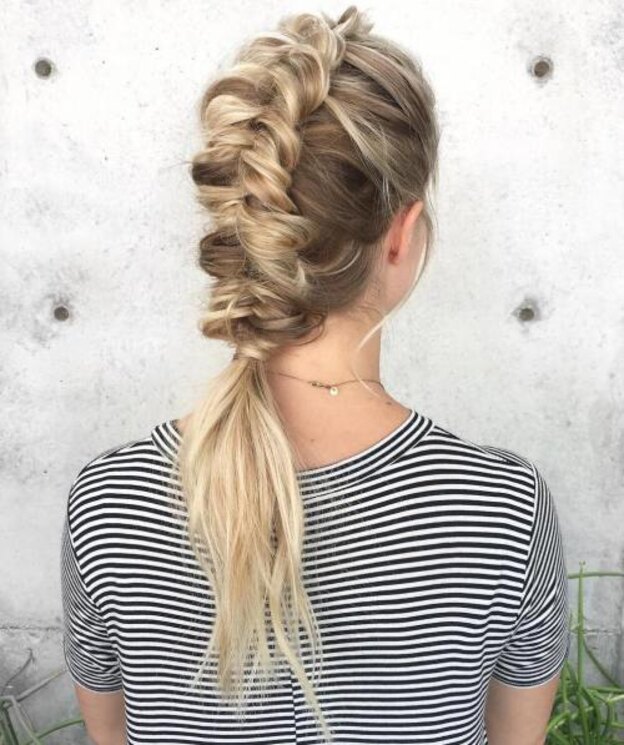 یکی از مزیت های بافت و دم اسبی این است که می توانید مدل های جدید را انتخاب کنید، مثل این موهاک. موهای جلو را بافته و به آن حجم بدهید.
