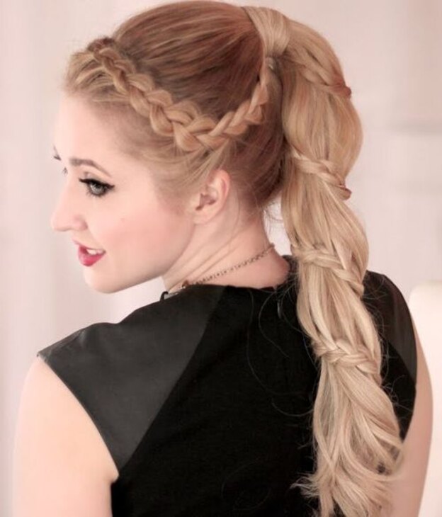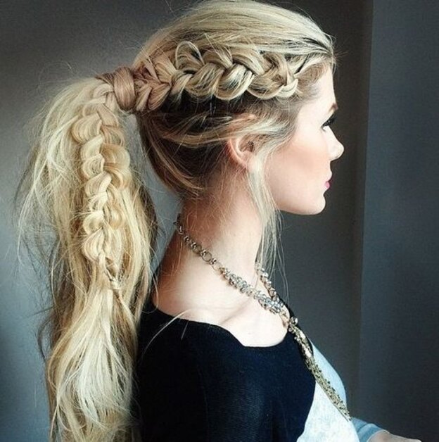 با این مدل شیک می توانید بافت و دم اسبی را در کنار هم داشته باشید. موهای خود را به سه قسمت تقسیم کنید، در طرفین بافت هلندی و در وسط بافت فرانسوی داشته باشید. بافت ها را با بقیه مو جمع کرده و به صورت دم اسبی ببندید.