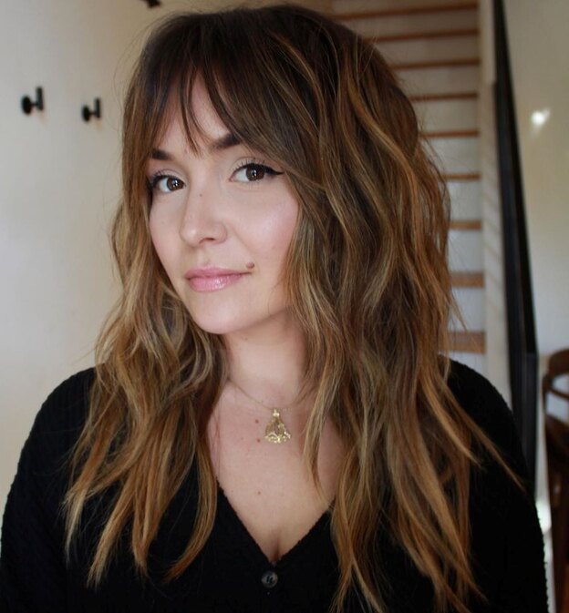 13. مدل موی مواج بلند: یک صورت بیضی با چتری صاف و موهای مواج گردتر به نظر می رسد.
