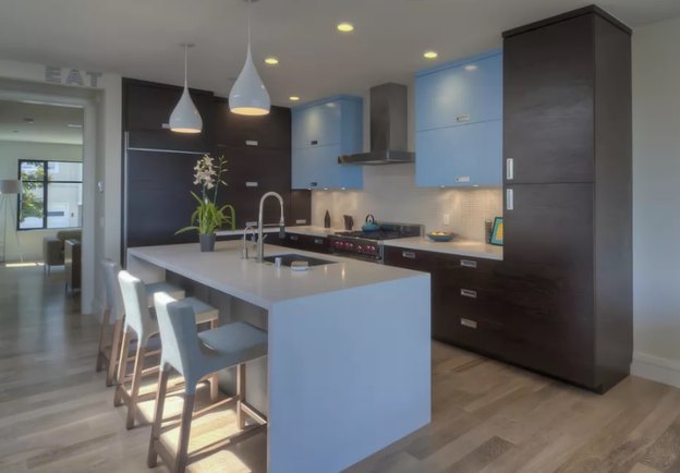 از کجا باید رنگ هر کابینت را انتخاب کنید؟ این آشپزخانه نشان می دهد که می توانید دو رنگ را به کار ببرید، بدون اینکه بیش از حد دیده شوند. کابینت های بالا و پایین را به یک رنگ که رنگ اصلی است تبدیل کنید. سپس چند کابینت بالا را به رنگ دوم رنگ آمیزی کنید. در این آشپزخانه رنگ قهوه ای تیره با کابینت های بالایی آبی هماهنگ شده اند.