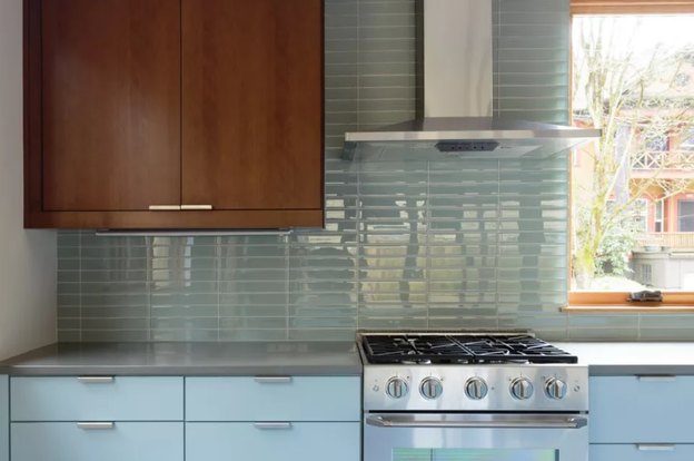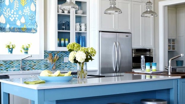 طرح دو رنگ می تواند در آشپزخانه های روستایی معاصر تا سنتی مناسب باشند. رنگ این آشپزخانه زیباست. زیرا در کابینت پایین رنگ آبی به کار رفته و کابینت بالا به رنگ چوب است. در این صورت دو رنگ متضاد را ترکیب کرده اید و نتیجه کار هم جذاب است. پس از چندین سال حوصله تان هم سر نمی رود.