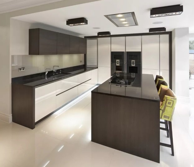 در آشپزخانه های طرح اروپایی رنگ های متضاد به کار می رود. درهای براق لعاب با طرح چوب یا لمینت هماهنگ شده اند. در این آشپزخانه کابینت های تیره بالا با کابینت روشن فضای متضادی را خلق کرده اند و هماهنگ شده اند. که البته کفپوش سفید هم این هماهنگی را افزایش می دهد. این نمونه ای از یک آشپزخانه زیبای دو رنگ است.