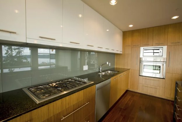 در این آشپزخانه از مواد مختلف استفاده شده است. درهای آلومینیومی سال هاست که در آشپزخانه ها استفاده می شود. در این آشپزخانه، چهارچوب آلومینیومی با در شیشه ای هماهنگ شده است و فضای زیبایی پدید آورده که با کابینت چوبی در پایین هماهنگ شده است.