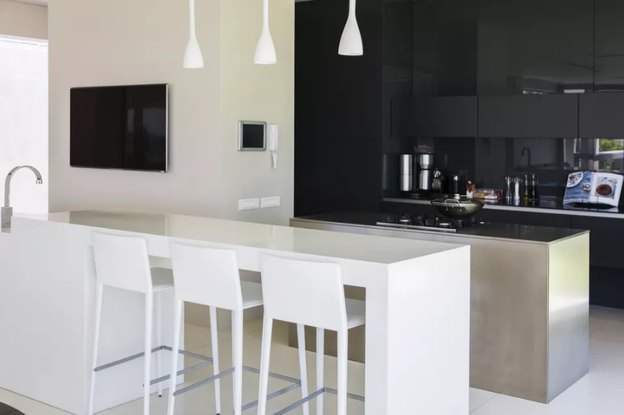 سیاه و سفید یک رنگ کلاسیک است که در آشپزخانه می تواند فضای خاصی را پدید آورد. از آنجایی که از رنگ سیاه استفاده کرده اید می توانید آن را با لوازم سیاه هماهنگ کنید.